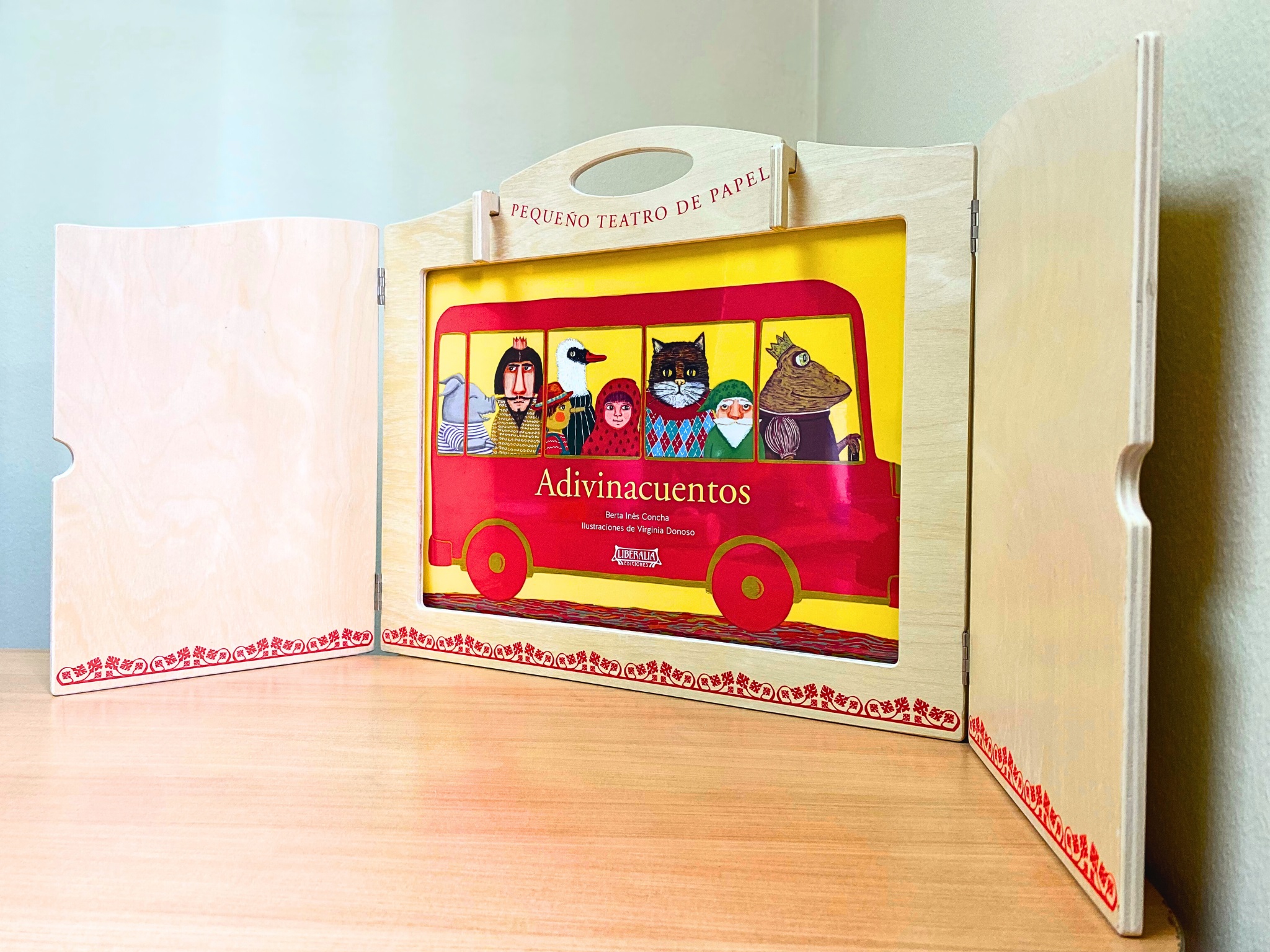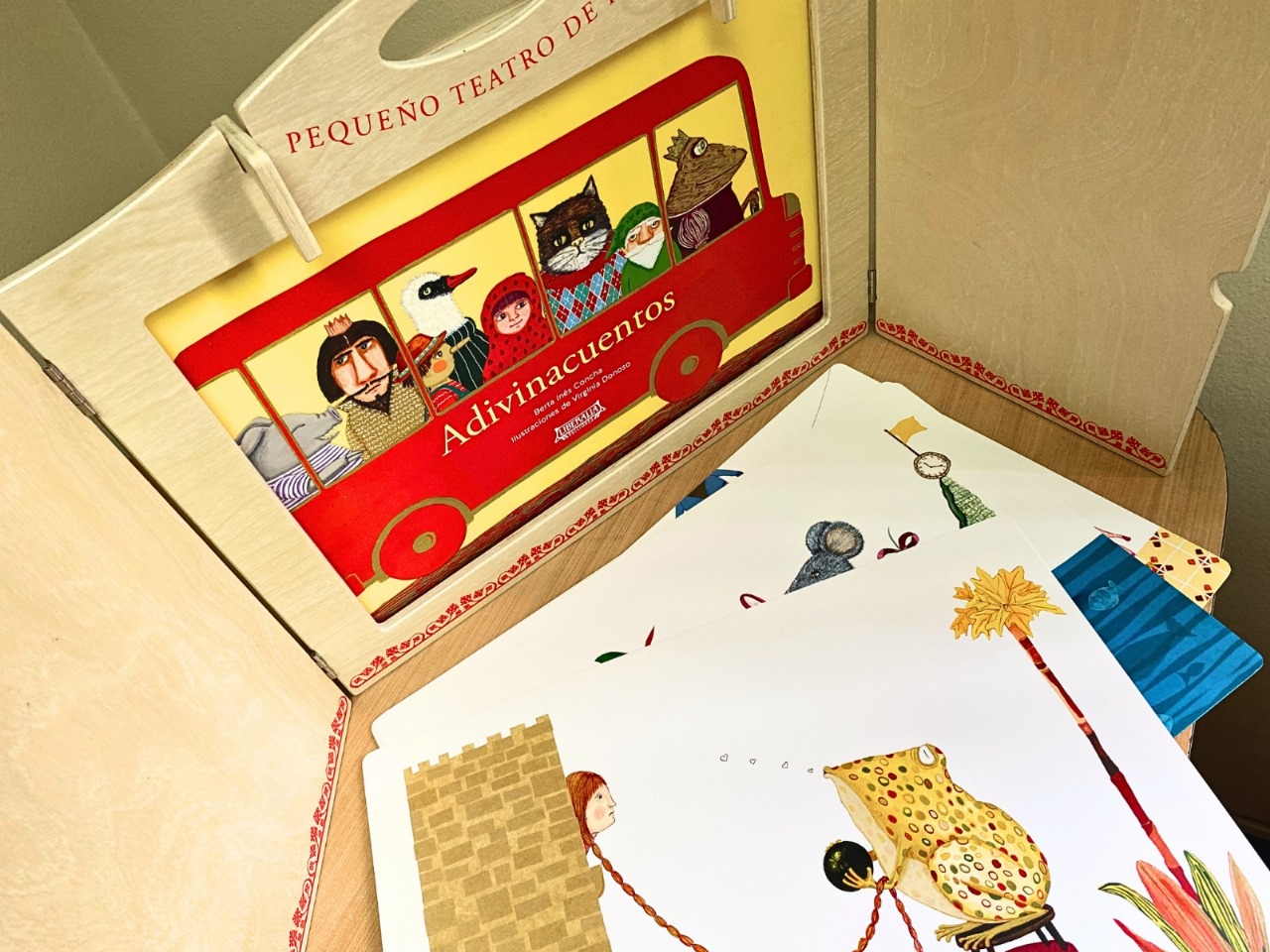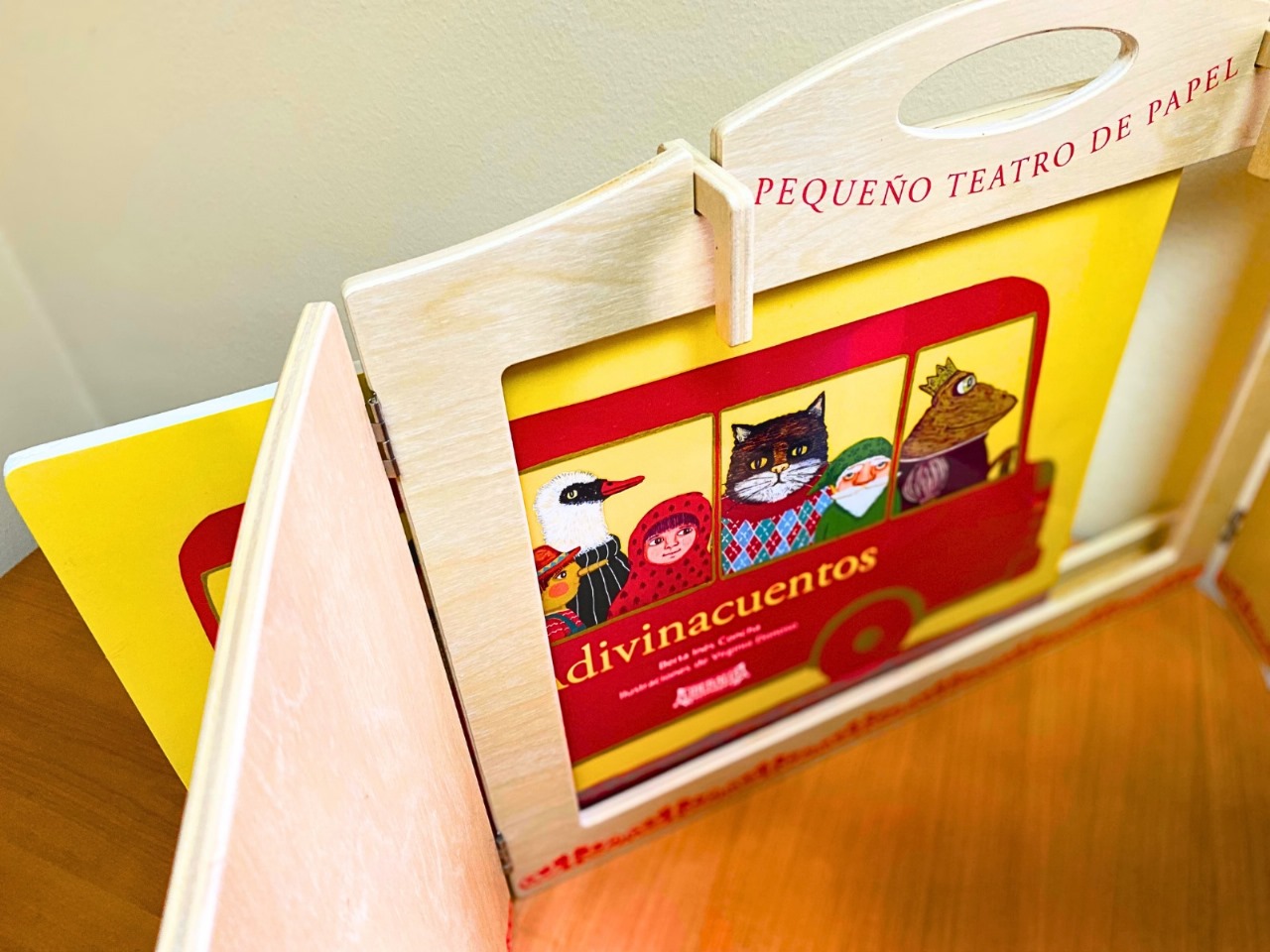 La estructura y dimensiones del Teatro Kamishibai de madera favorecen la interacción con niños y niñas, quienes oyen el relato mientras observan las imágenes.