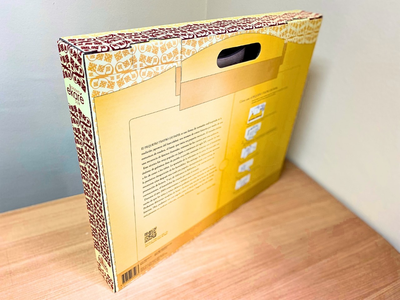 El Teatro Kamishibai de madera viene en una caja de cartón que permite guardarlo y transportarlo, y que además tiene impresas las instrucciones para uso y algunos consejos prácticos.